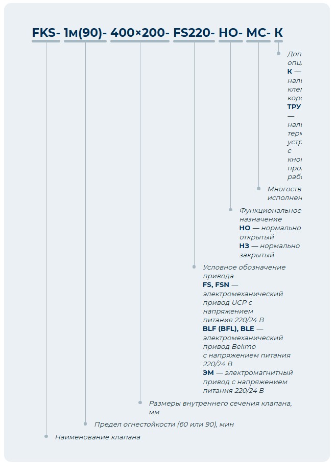 Противопожарный клапан систем вентиляции зданий и сооружений FKS-1м(90) в многостворчатом исполнении по своему функциональному назначению может применяться как в качестве огнезадерживающего с нормально открытой заслонкой (НО), так и дымового с нормально закрытой заслонкой (НЗ), согласно требованиям СНиП 41-01-2003 и СП 7.13130.2009. Вид климатического исполнения и категория размещения У3 по ГОСТ 15150-69. Предельные значения рабочей температуры окружающего воздуха от -30°С до +40°С при условии отсутствия прямого воздействия атмосферных осадков. Клапан выпускается прямоугольного (квадратного) сечения. Устанавливается в проемах или местах прохода вентиляционных систем через противопожарные преграды. Клапан работоспособен в любой пространственной ориентации. Не подлежит установке в вентиляционных каналах помещений категории А и Б по взрывопожароопасности, местных отсосах взрывопожароопасных смесей. Клапан изготовлен из оцинкованной стали. Возможно изготовление защитного корпуса, предохраняющего привод при монтаже и эксплуатации клапана.