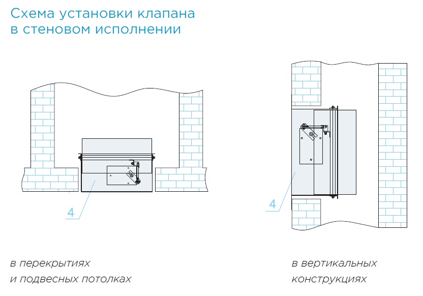Установка клапана осуществляется в соответствии с требованиями нормативных документов. Клапан монтируется в проеме строительной конструкции с расположением привода, как правило, в помещении, смежном с обслуживаемым (пожароопасным) помещением. Зазор между корпусом клапана и строительными конструкциями заполняется цементно-песчаным раствором. При установке клапана необходимо обеспечить доступ к приводу. При установке клапанов FKS-1м(90)-МС за пределами стен (перекрытий) наружная огнезащита должна наноситься до оси заслонки клапана, и в соответствии с требованиями СП 60.13330.2012 и СП 7.13130.2013 должна обеспечивать предел огнестойкости не менее предела огнестойкости преграды.
