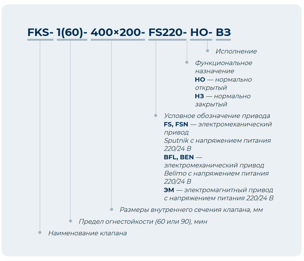 Взрывозащищенные клапаны могут устанавливаться в помещениях, отнесенных к категориям А или Б по взрывопожарной опасности в соответствии с Федеральным законом №123-Ф3 и СП 12.13130.2009, а также во взрывоопасных зонах, где по условиям эксплуатации возможно образование взрывчатых смесей, газов, паров с воздухом, слоёв горючей пыли и взрывчатых пылевоздушных смесей. Маркировка взрывозащиты клапанов FKS-1-ВЗ(ЕI60), FKS-2-ВЗ(ЕI90) —II Gb c Tx.