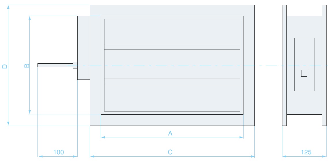 В алюминиевой заслонке длина всегда постоянна и равна 125 мм. При высоте заслонки B не кратной 100 мм, оставшаяся часть перекрывается полосой оцинкованной стали.