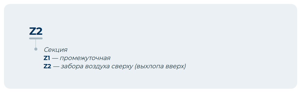 Секция представлены восемью типоразмерами. Секция Z2 доукомплектовывается верхней торцевой панелью: для забора воздуха — с заслонкой и мягкой вставкой, для выхлопа воздуха — мягкой вставкой. Размещение заслонки на торцевой панели возможно только с наружной стороны кондиционера.