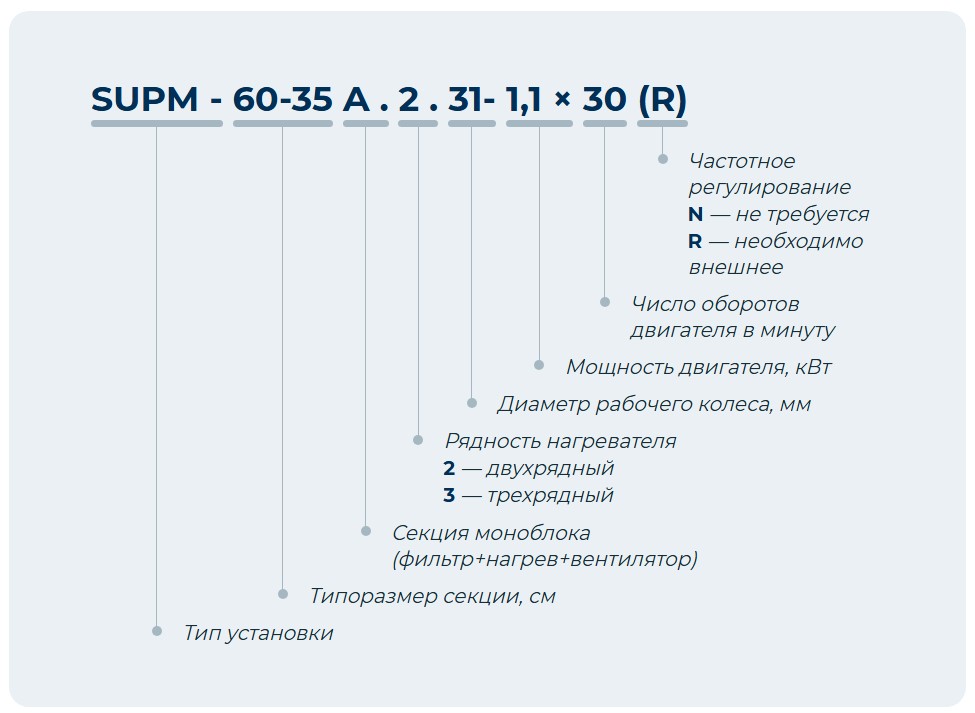 Секция моноблока SUPM A представлена восемью типоразмерами. Конструктивно состоит из следующих функциональных элементов: фильтр EU4, водяной нагреватель, вентилятор. Конструкция секции позволяет организовать выхлоп воздуха как прямо, так и вверх посредством перестановки торцевой и верхней панелей. Рабочие колеса из оцинкованного стального листа. Используется «свободное» рабочее колесо с назад загнутыми лопатками. Для нагрева воздуха используются двухрядные и трехрядные нагреватели SPHW. Фильтрующая вставка предназначена для очистки воздуха, а также для защиты теплообменника от загрязнения. Быстросъемные сервисные панели, оснащенные ручками, позволяют производить замену фильтрующей вставки слева/справа.