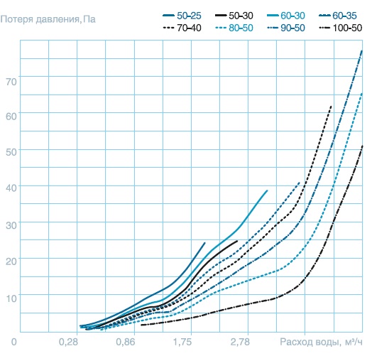 | Типоразмер | Расход воздуха, м³/ч | Расход воды, м³/ч | Гидравлическое сопротивление, кПа | Теплопроизводительность, кВт |