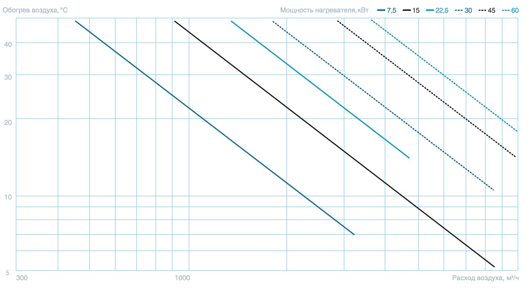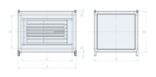 | Типоразмер | A, мм | B, мм | C, мм | D, мм | E, мм | Мощность нагревателя, кВт | Масса, кг | Номер аэродинамической кривой |