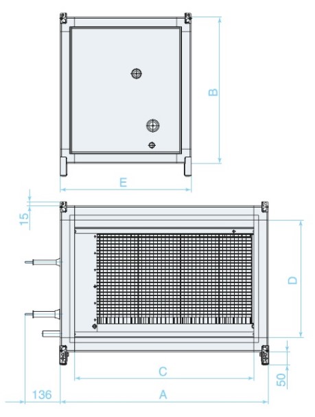 Охладитель устанавливается поддоном вниз как в напольном, так и в подвесном исполнении путем трансформации ножек в кронштейны для подвеса без использования дополнительных деталей. Для предотвращения загрязнения охладителя необходимо перед ним установить воздушный фильтр. Охладитель следует подключать по принципу противотока, так как при использовании прямоточной схемы подвода хладоносителя мощность охладителя снижается.