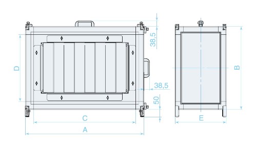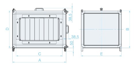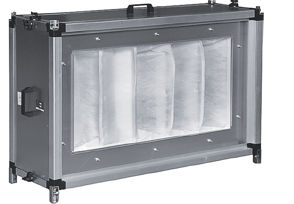 Фильтрующий элемент изготовлен из нетканого синтетического полотна и закреплен на каркасе. Быстросъемные сервисные панели, оснащенные ручками, позволяют производить замену фильтрующей вставки слева/справа. Рабочий диапазон температур проходящего воздуха от -40°C до +70°C.