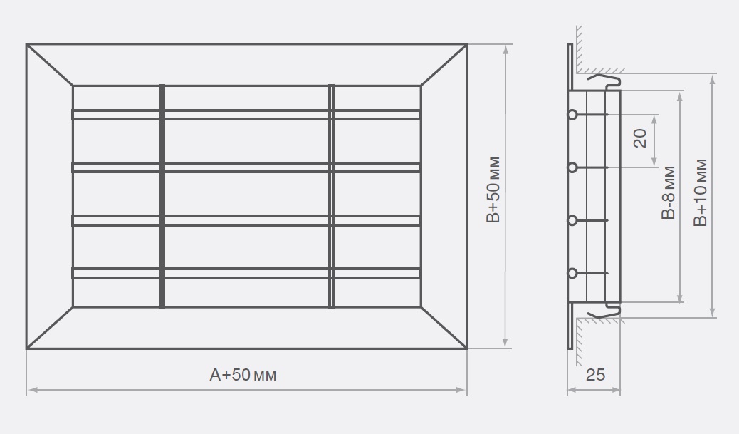 Решетки SGON предназначены для подачи и удаления воздуха системами вентиляции и кондиционирования в помещениях любого назначения. Они представляют собой раму прямоугольной формы с установленными в нее фиксированными горизонтальными жалюзи. Простота и надежность настенного монтажа к воздуховодам обеспечивается с помощью установленных на боковых стенках решетки пружинных фиксаторов. Потолочный монтаж рекомендуется производить с помощью самонарезающих винтов. Для удобства установки решетки могут дополнительно комплектоваться монтажной рамой. Решетки окрашиваются методом порошкового напыления в белый цвет (RAL 9016). При изготовлении продукции на заказ возможна окраска в любой цвет по каталогу RAL или текстурирование. Минимальный размер решетки 100 x 100 мм, максимальный 1200 мм по одной из сторон, шаг 50 мм, также возможно изготовление под заказ решеток с нестандартным шагом.
