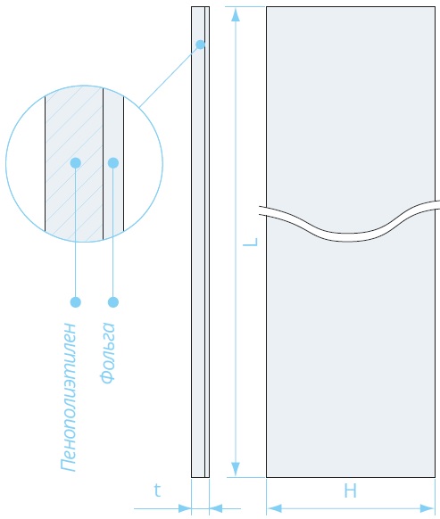 Полотно из вспененного полиэтилена НПЭ, дублированного с одной стороны алюминиевой фольгой, с другой — нанесен клей, защищенный пленкой.
